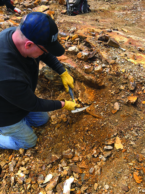 For our next dig destination, the group went a few hundred yards out to a trench where people find agate. The digging there is called the Abo Pit. The upper layers have a peanut-butter-colored jasper, and the lower layers produce a yellow-to-clear translucent agate with peanut-colored spheres or blobs throughout. Some agate appears with yellow plumes, but I did not see any of this come out that day. Our effort was hard rock mining in an exposed trench where the group dug not much agate, but club vice president Steven Barnett hammered and wrestled a 200-pound chunk of solid agate out of the trench wall while the rest of us cheered him on.