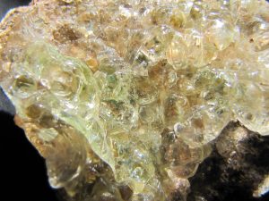 Hyalite also exhibits the rare phenomenon of “daylight fluorescence” which occurs when sunlight energizes electrons within the opal. These electrons then release excess energy as visible, greenish-yellow light. The combination of daylight fluorescence and hyalite’s base color produces a particularly pure and lively greenish-yellow hue. Hyalite’s daylight fluorescence and its strong, ultraviolet fluorescence are because of traces of the radioactive element uranium.