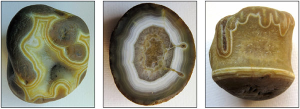 These Columbia Basin Agates have also been transported long distances from their source. While they were forming in hollow cavities it looks like the first pulses of silica laid down the parallel bands of water level agate and agate stalagtites that formed the tubes and eyes seen in some of the specimens. Later activity produced the banding, and still later quartz crystal formation in the centers finished the process. That is my best guess from the evidence I have seen so far.