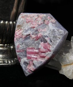 The rose-pink color of the tourmaline variety known as rubellite and how it contrasts with the lilac-gray of its lepidolite host rock seems to be one of the first things about the rubellite-lepidolite combination that catches people’s attention. When you look more closely at rough pieces of rubellite, you will see that the tourmaline’s natural crystal habit, with its characteristic striations, captures the light beautifully.