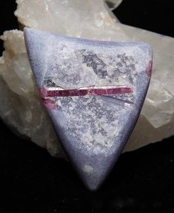 With rough like the rubellite-lepidolite combination, I work through my wheels slowly, protecting the side that is showing the near-perfect striated rubellite. I decide whether I want the lepidolite to be smooth or left grainy and rough. I continue until I have produced something that I feel shows the natural beauty of the mineral and crystals I am cabbing and might be either a display piece or one that could be set for jewelry. I like to think the stone knows what it wants to be, and enjoy it when I am able to help show the stones as they were found in my cabbing.